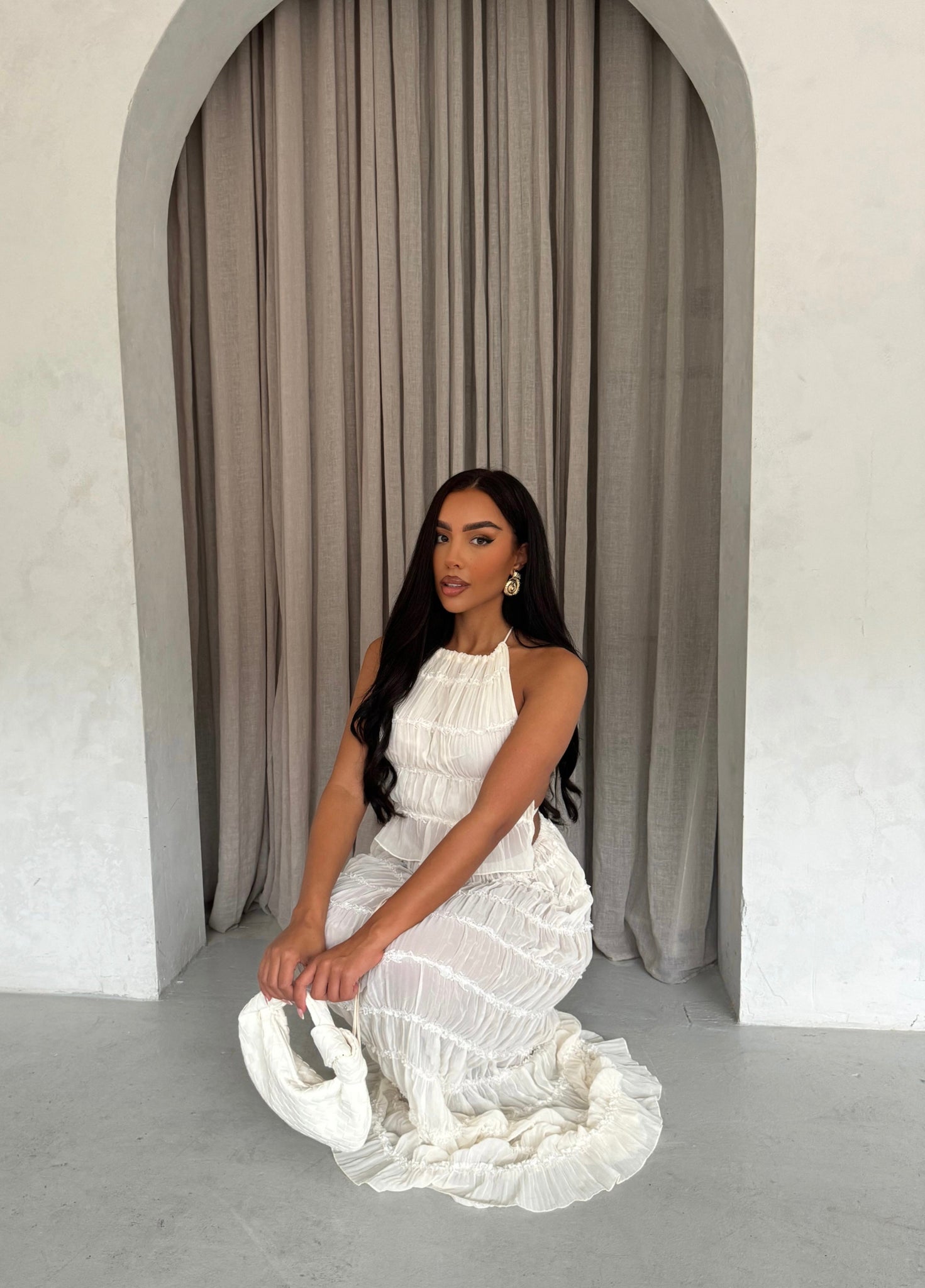 - Pasvorm: Relaxed fit top met verstelbare halternek, A-lijn maxi-rok met ruches