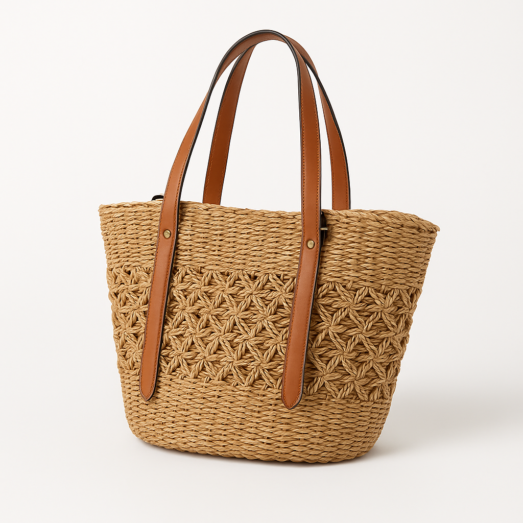 - Materiaal: Hoogwaardig geweven stro, faux lederen schouderbanden.